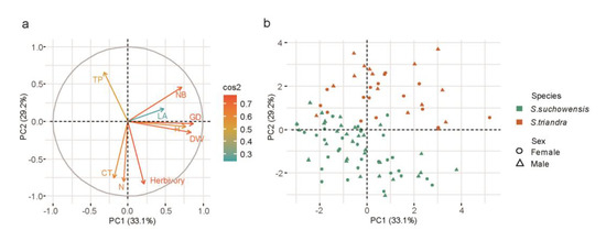Principle component analysis (PCA) of the selected variables. (a) Relationships between all the variables; (b) under different species and genders. Notes: The variables are listed as follows: N, N concentration; CT, condense tannin; TP, total phenol; Herbivory, insert herbivory; DW, shoot dry weight; GD, ground diameter; H, plant height; NB, number of lateral branches; LA, leaf area. cos2 value indicates contribution of variables in PCA results.