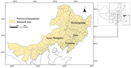 The study area spans 275 counties (county-level cities and districts) under the jurisdiction of Heilongjiang, Jilin, and Liaoning provinces and the Inner Mongolia Autonomous Region of Northeast China (97°12′, 135°05′ N; 37°24′, 53°33′ E) with an area of 199.14 million hectares (Figure 1). This area has extensive forest coverage with a wide variety of trees. It is not only the location of the largest natural forest area, the Northeast Forest Region composed of the Greater and Lesser Khingan Ranges and Changbai Mountains, but also contains the large-scale artificial afforestation project called the Three-North Shelterbelt Program. According to the China Statistical Yearbook on Environment (2018), the forest area in these northeastern provinces reaches 57.71 million hectares, accounting for 27.79% of the national forest area. In 2017, the afforestation area was 1.08 million hectares, accounting for 14% of the country. According to the Flora of China (2004), around 59 species of Populus and Salix, susceptible to poplar canker, are cultivated throughout the study area. The climate of the study area includes a temperate monsoon climate and a temperate continental climate, so the seasonal changes of temperature and humidity are distinct. The spatial heterogeneity of climate characteristics is evident in the study area. Its average annual temperature ranges from −3.6 °C to 11 °C, and the annual precipitation ranges from 64 to 1100 mm. The climate in Northeast China from March to June is suitable for the occurrence and spread of poplar canker. This disease usually occurs in late March and April every year, and its incidence rate reaches its peak of incidence between May and June [6].