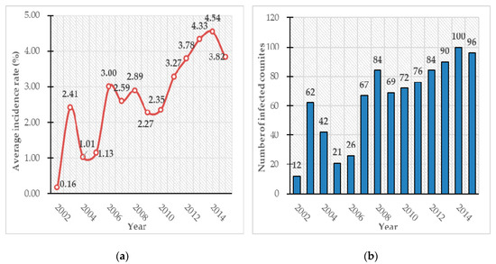 (a) Annual variation of the average incidence rates of all counties in the study area from 2002 to 2015; (b) Annual variation of the number of infected counties in the study area from 2002 to 2015.