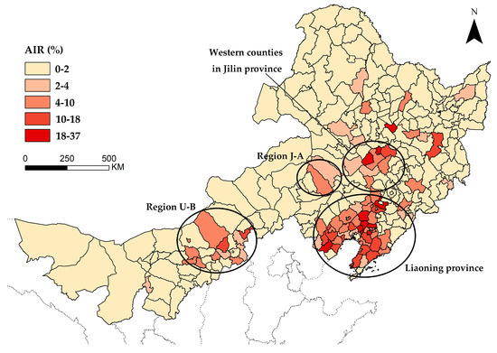 Poplar canker in central Liaoning province had a high incidence rate, and it continually occurred for a long time in this area. The AIR in Xinmin city, Liaozhong county, Taian county, Dengta city, and the Anshan municipal district were all over 18%. Liaozhong county and three other counties suffered from the disease for 13 consecutive years. Another seven counties, including Xinmin city, suffered from the disease for 12 years during the study period. The AIR of five counties in Western Jilin, led by Songyuan municipal district and Qian’an county, ranged from 7% to 25% and only occurred from 2007 to 2008 and 2012 to 2015. In region U-B, the AIR ranged from 2% to 12.8% in many areas, and the first case of poplar canker was reported in 2010. Then, the disease spread and became exacerbating around 2012. In region J-A, poplar canker broke out at the beginning of the study period and continued for a more extended period compared to region U-B, and its AIR ranged from 2.2% to 5.4%.