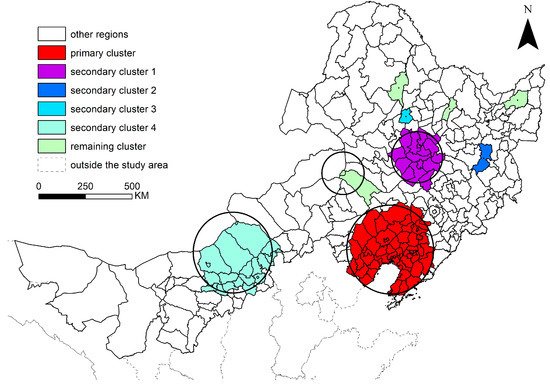 The spatial scan of the cumulative incidence area of poplar canker identified one primary cluster and eight secondary clusters (Figure 5). The primary cluster was located in Liaoning province and its western contiguous zone with a radius of 234.88 km was geographically centered around Beizhen city (RR = 9.68, p < 0.001). The secondary cluster 1 was located in the junction of Western Jilin and Southwestern Heilongjiang with a radius of 136.41 km centered around Zhaoyuan county (RR = 4.63, p < 0.001). Secondary clusters 2 and 3 were each located in one county, Hailin city (RR = 8.07, p < 0.001) and Fuyu county (RR = 5.93, p < 0.001), respectively. Secondary cluster 4 covered region U-B and four counties of Xilin Gol league and Hohhot city (RR = 1.98, p < 0.001), centering on Siziwang banner with a radius of 213.59 km. The remaining secondary clusters were scattered in Jarud banner and Huolin Gol city and other places with relatively low incidence rates but significant aggregation effects (RRs = 1.49–3.32, p < 0.001).