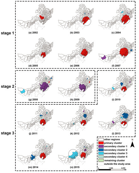 (a) to (n) correspond to annual variation of spatial distribution clusters detected by spatial scan statistics from 2002 to 2015 respectively.