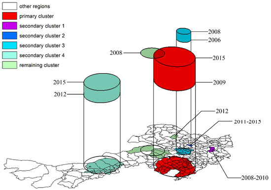 Purely spatial scan statistics conducted for each year detected 14 primary clusters and 37 secondary clusters (Appendix Table A1), indicating three phases of aggregation (Figure 6). The first stage occurred from 2002 to 2007, the number of detected clusters was small, and their location was singular during this period. The primary cluster presented regular changes in the aggregation radius and number of counties exhibiting the “expansion-centralization-expansion” pattern with the movement of the aggregated barycenter. The aggregation area of disease extended southeastward to Liaoning province and Jilin province. After the disease concentrated in Liaoning province, its aggregation effects expanded again. There were only a few irregular secondary clusters, and these clusters did not represent the risk of further aggregation at the time. The second stage occurred from 2008 to 2009, when Hailin city was severely infected and replaced the Liaoning province and Jilin province clusters as the primary cluster. The latter became secondary cluster 1 and exhibited a decreasing trend of the radius, thereby moving the barycenter to Liaoning province. More secondary clusters appeared in Heilongjiang province during this period. The third stage occurred from 2010 to 2015, the location and coverage of the primary cluster each year were relatively stable, and the number of secondary clusters increased. New stable clusters formed around Songyuan city and Ulanqab city, respectively.