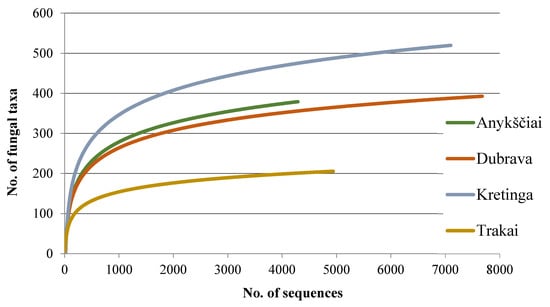 Among the non-singletons, 895 (69.6%) were representing fungi and oomycetes, and the remaining 391 (30.4%) were non-fungal, which were excluded. The number of high-quality sequences and fungal taxa from each study site are in Table 2. A plot of fungal taxa from four forest nurseries vs. the number of fungal sequences resulted in species accumulation curves that did not reach the species saturation (Figure 1), indicating that a potentially higher diversity of taxa could be detected by deeper sequencing. In this study, the detected fungi were 57.3% Ascomycota, 38.1% Basidiomycota, 3.1% Chytridiomycota, 0.8% Mucoromycota, and 0.7% Oomycota.