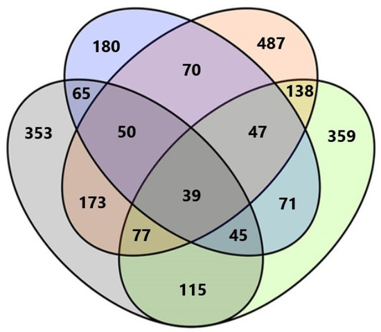 Venn diagram showing the diversity and overlap of fungal taxa in water filtrate samples from four forest nurseries. Different colors represent different forest nurseries: Green—Anykščiai, Orange—Kretinga, Blue—Trakai, Gray—Dubrava.