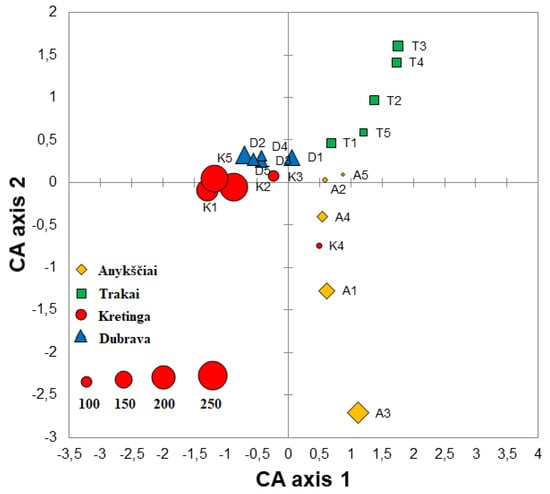 Ordination diagram based on the correspondence analysis (CA) of fungal and oomycete communities in water filtrate samples from four forest nurseries: Anykščiai, Dubrava, Kretinga and Trakai. Each point in the diagram represents a single sample, and the size of each point reflects the richness of fungal taxa as shown in the lower left corner.