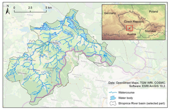 The middle part of the Stropnice River flows through the foothills of the Novohradské Mountains, consisting of forested uplands and highlands disaggregated by numerous depressions. It is an area with a relatively easily identifiable extent of floodplain with a width of about 100 m. In this area, the Stropnice River typically consists of alternating segments of bends and meanders, which (together with hydromorphological properties) indicate a relatively low anthropogenic influence, and shorter segments of straightened channels (often occurring along roads) significantly influenced by human activities. The lowest river segments are located in the lowland area of the southern edge of the Třeboň Basin (roughly from river 43.9 km), where the floodplain, formed mainly by Gleysols and Fluvisols [38], reaches up to 500 m in width. The overall ecological status of the river network in this area was significantly degraded by human activities, which culminated in the straightening of the Stropnice riverbed and its reinforcement with shaped grass concrete, cemented bricks or concrete embankments from the 1970s to the 1990s. Ploughing of the whole floodplain and exploitation of the adjacent land up to the edges of the newly constructed channel has led to the destruction of the floodplain ecosystem and to the loss of its natural ecological functions. However, since the late 1990s, a considerable part of the floodplain has been transformed into meadows and pastures; this transformation can be considered a positive change in terms of ecological stability of the floodplain in the given area. On the other hand, it should be noted that even this type of land use is not optimal, as pastures can have a negative effect on freshwaters’ chemical conditions. The actual channel of the Stropnice River, nonetheless, remains in an unsatisfactory status—it has been artificially straightened and provided with embankments, which prevent the natural biological and geomorphological evolution of the stream. Figure 1 shows the location of the study area.
