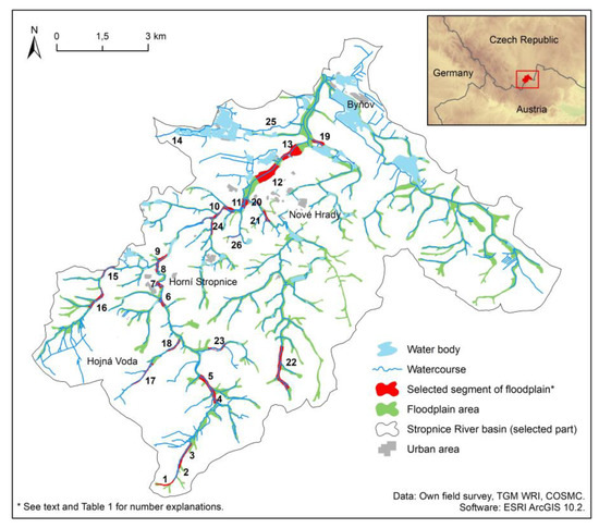 Considering the local conditions of the study catchment, a width of 5 m was selected as the optimal size of the riparian zone. As a further step, we chose 26 floodplain segments in various parts of the catchment representing the specific conditions forming the current status of the river network (a list of the segments selected is given in Table 1). All individual segments are homogeneous in terms of the current hydromorphological status and the prevailing erosion and aggradational processes. The exact position of boundaries between the individual watercourse (and riparian area) segments were determined on the basis of a change in the character of the riverbed’s hydromorphological features, especially the channel forming material (e.g., at the boundary between an anthropogenically modified channel and a relatively natural channel). Figure 2 shows the locations of the defined segments. The main reason for selecting the given segments is the effort to capture the typical conditions prevailing in the selected river basin—i.e., to select an approximately equal number of segments in the upper; middle and lower parts of the catchment (sediment source, transfer and accumulation zone of the river), which, at the same time, will be homogeneous throughout their length in terms of the riverbed hydromorphological characteristics and the use of the surrounding landscape. The individual segments were numbered in the direction from the headwater area towards the lower parts of the basin, with the main watercourse (i.e., the Stropnice River) being numbered first.
