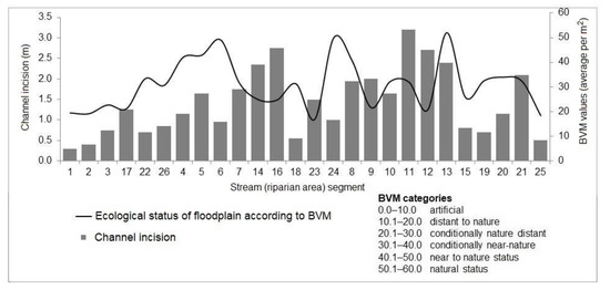 A different situation occurred when evaluating the environmental status of floodplain lining the river network in almost its entire length. When evaluating the habitats in accordance with the BVM method [47], we found that the floodplain reached the highest values at the lower-course stream, marginally also at the middle course, typically in the segments with a more significantly developed alluvial ecosystem in terms of its width dimensions. Despite the fact that these floodplain segments are often intensively used by man, the various habitat types occurring here showed a slightly increased diversity (the BVM values vary around 45.0—i.e., they reach about half of the maximum habitat value identified in the Czech Republic).