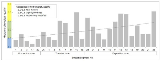 Hydromorphological status of streams (its segments) according to the hydro-ecological monitoring (HEM) methodology [50]; the lower, the better.