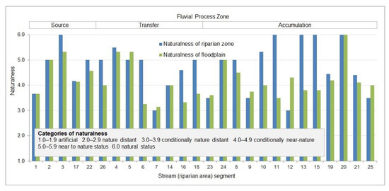 In addition, habitat naturalness, one of the most important features in assessing the floodplain environmental status according to the BVM methodology (from a total of eight indicators), was selected and analyzed in detail for each floodplain and bank zone segment. Habitat naturalness assesses the presence of synanthropic species, which is expressed as a percentage of their numerical representation in the relevant vegetation floor in the area of habitat considered (more information about the principle of determining this naturalness is given by Seják et al. [47]). The results of the analysis of naturalness (Figure 3) show that the actual level of naturalness in the various floodplain segments was quite variable, and in some cases, it reached almost the maximum possible value 6 points. Whereas the naturalness values appear to be average in the upper-course transport segments, when elevation decreases (lower-course transport segments and aggrading segments), variability tends to increase, and segments with almost minimal naturalness and segments with close-to-natural habitats occur more frequently.