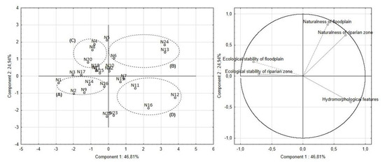 This study focused mainly on the analysis of the relations and interactions between the hydromorphological status of the river network and the ecological status of the relevant floodplain segments (shown in Figure 2). This data can be obtained mainly through principal component analysis (PCA), which allow us to identify patterns in data based on the correlation between features and aims to find the directions of maximum variance in high-dimensional data and projects it onto a new subspace [63]. Data on the hydromorphological status (outputs of the HEM methodology), the naturalness of floodplain and riparian zone (one of the indicators determined within the BVM method), as well as the ecological stability of these areas, were used as input variables for PCA. The ecological stability was determined according to Míchal [64] as a ratio between the area of ecologically stable land-use categories (forests, meadows, pastures and water bodies) and ecologically unstable categories (urban areas and arable land). The outputs show that the first three components explain 88.6% of the total variability, with the largest part being hydromorphological features (1st component, 46.8%), naturalness of the floodplain (2nd component, 24.9%) and ecological stability of the floodplain (3rd component, 16.8%). The outputs of the analysis provided information about the existence of several specific types of interactions between the channel features and the ecological status of the surrounding landscape (outputs of the PCA is shown in Figure 6). According to these parameters, the stream segments, which share similar features and types of interaction between the fluvial and terrestrial parts of the river landscape, can be aggregated into several groups (Table 6 and Figure 6).