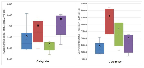 Descriptive data (box plots) for the four identified groups (categories A–D) of stream segments, differing in terms of the prevailing hydromorphological status of the stream and the environmental status of the floodplain.