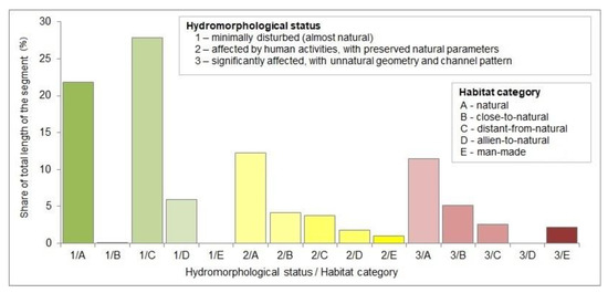 Classification of hydromorphological status based on the hydromorphological quality computed according to the European Standard EN 14614 [50].