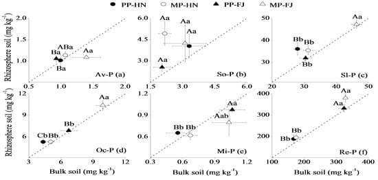 Variations in rhizosphere and bulk soil phosphorus fractions in pure Chinese fir plantations (PP) and mixed plantations with broadleaved tree species (MP) in Hunan and Fujian provinces of China. Note: The bar represents standard error and meaning of abbreviated words are as follow: PP-HN indicates the pure plantation in Hunan province, MP-HN indicates the mixed plantation in Hunan province, PP-FJ indicates the pure plantation in Fujian province, MP-FJ indicates the mixed plantation in Fujian province. Av-P indicates available P, So-P indicates soluble P, Sl-P indicates slowly released P, Oc-P indicates occluded P, Mi-P indicates mineral P, Re-P indicates residual P. The symbols located above and below the dotted line indicate the positive and negative rhizosphere effect, respectively. Among treatments, different small and capital letters indicate the significant differences in rhizosphere and bulk soils, respectively, probability level p < 0.05.