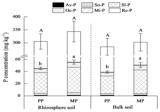 The components of soil phosphorus fractions in pure Chinese fir plantations (PP) and mixed plantations with broadleaved tree species (MP) in Hunan and Fujian provinces of China. Note: The bar represents standard error. Av-P indicates available P, So-P indicates soluble P, Sl-P indicates slowly released P, Oc-P indicates occluded P, Mi-P indicates mineral P, Re-P indicates residual P. Different small and capital letters indicate the significant differences of total extractable P (the sum of Av-P, So-P, Sl-P, Oc-P, and Mi-P) and total P, respectively, among the four soil sources (two forest types in rhizosphere or bulk soils, probability level p < 0.05.