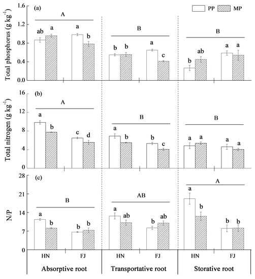 Total P concentration in absorptive and transportive roots is higher in PP than MP in the Fujian site, whereas it was not significantly different in roots between PP and MP in the Hunan site. Total N concentrations in absorptive and transportive roots were higher in PP than MP in each site of Hunan and Fujian provinces. Thus, the average N concentration in roots was also higher in PP than MP, although there were not statistical differences between both forest types in storative roots. The N/P ratio in all orders of roots seemed to be higher in PP than MP in the Hunan site (Figure 3 and Table S2). Meanwhile, total P and N concentrations were generally higher in absorptive than transportive and storative roots, and the N/P ratio was highest in storative roots, followed by transportive roots, and lowest in absorptive roots. In addition, the average P concentration was significantly higher in the Fujian than the Hunan site, while the average N concentration and N/P ratio showed the opposite trends (Figure 3).