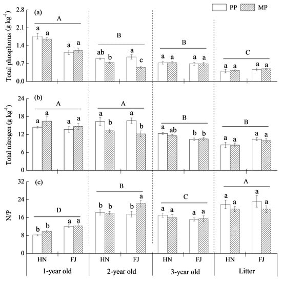 Phosphorus and nitrogen concentrations and N/P ratios of Chinese fir different-aged fresh needles and needle litters between pure Chinese fir plantations (PP) and mixed plantations with broadleaved tree species (MP) in Hunan and Fujian provinces of China. (a) Total Phosphorus (g kg−1), (b) Total nitrogen (g kg−1), (c) N/P. Note: The bar represents standard error. Different small and capital letters indicate the significant differences among the four treatments within a same age needle, and among these four age needles, respectively, probability level p < 0.05.