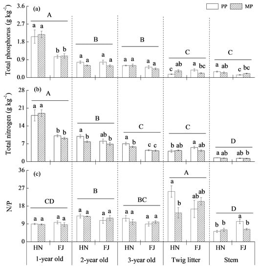 Phosphorus and nitrogen concentrations and N/P ratio of Chinese fir different-aged fresh twigs, twig litters, and stems between pure Chinese fir plantations (PP) and mixed plantations with broadleaved tree species (MP) in Hunan and Fujian provinces of China. (a) Total Phosphorus (g kg−1), (b) Total nitrogen (g kg−1), (c) N/P. Note: The bar represents standard error. Different small and capital letters indicate the significant differences among the four treatments within a same-aged twig, and among the four ages of twigs and stems, respectively, probability level p < 0.05.