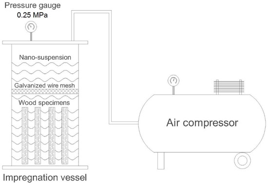 Specimens were first cut to size for different tests and then, impregnated with a 400-ppm silver nanosuspension. The dimensions of specimens for each test are mentioned in the following sections (Section 2.5). The pH of the nanosuspension was 6–7. Two kinds of surfactants (anionic and cationic) were used as stabiliser of nanosilver clusters. Concentration of surfactants was equal to nanosilver clusters. The size of 70% of silver nano-particles ranged from 20 to 100 nm. Specimens were put in a sealed pressure vessel to be impregnated. First, a 0.07 MPa vacuum pressure was applied for twenty minutes. Then a 0.25 MPa pressure was applied for thirty minutes (Figure 1). Once impregnated, they were kept in room conditions (25 ± 3 °C; 35 ± 3% relative humidity) to be dried for a period of three months. Separate specimens were impregnated simultaneously for checking the depth of penetration of nanosuspension. Immediately after the impregnation, these specimens were cut in half to visually investigate the depth of penetration of nanosilver suspension. It was observed that all throughout the specimens (and all of the inner parts) were fully impregnated with the suspension, confirming that the suspension had reached all of the surface and inner parts of the specimens equally.
