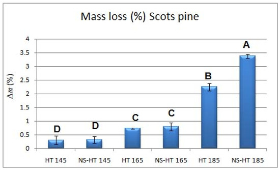 Comparison between the results of the present study with those previously carried out under the same temperatures and conditions on beech wood (as a popular industrial hardwood species) demonstrated lower weight losses as a result of heat treatment in all treatments [46]. At temperatures of 145 °C and 165 °C, neither of the species (beech or Scots pine) showed difference in weight loss between un-impregnated and NS-impregnated specimens. However, at a temperature of 185 °C, the difference was higher in pine wood in comparison to beech wood. Though fluctuations can be observed between the two species, the overall decreasing trend in VS was obvious in both species. All mechanical properties of beech were significantly higher than their counterparts in pine wood, which is only natural considering the higher density of beech wood (0.62 g.cm−3 and 0.47 g.cm−3 for beech and Scots pine wood, respectively).