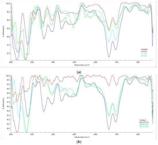 Infrared spectra of control and heat-treated (a) and control and NS-impregnated heat-treated (b) Scots pine specimens (HT = Heat-treated; NS = nano-silver impregnated).