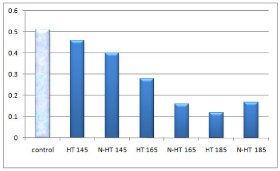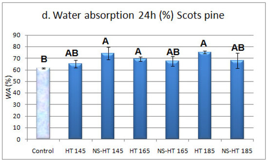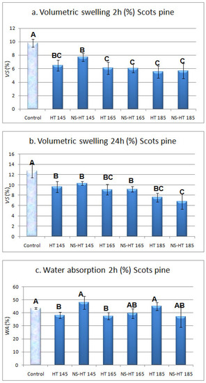All heat-treated specimens showed significant lower volumetric swelling (VS) in comparison to the control specimens (Figure 4a,b), and a decreasing trend in VS was observed along with the increase in temperature. The decrease in VS was partially attributed to the irreversible hydrogen bonding in the course of water movements within the pore system of cell walls, forming rather permanent bonds with hydroxyl groups of cell-wall components and making them unavailable for water molecules, eventually decreasing hygroscopicity in wood [63]. Intensities of wave numbers of 3300–3100 cm−1 and 1600 cm−1 are related to O-H stretch and hydroxyl groups [61,62]. FTIR spectra of the treatments in the present study demonstrated distinct fluctuations in intensity, indicating that the hydroxyl groups at these bands were unavailable to make bonds with water molecules (Figure 3a,b). This was considered one of the main reasons of the significant decrease in VS in all heat-treated specimens. VS values followed no distinct pattern between the un-impregnated versus NS-impregnated specimens. VS values in pine specimens generally showed lower values in comparison to beech specimens studied previously [46,55]. This was attributed to lower woody mass in pine wood in comparison to beech wood. This was also associated with higher water absorption (WA) values in pine specimens in comparison to beech, indicating the impact of lower density and higher cell cavities on both physical properties of VS and WA. As to water absorption values, all heat-treated specimens illustrated higher WA values after 24 h of immersion in water in comparison to the control specimens, though no regular pattern was observed (Figure 4c,d). This may be attributed to occurrence of micro-checks and cracks that were reported as a result of heat treatment in hardwood species [64,65]. However, microscopic imaging should be done to come to a final firm conclusion with regard to WA.