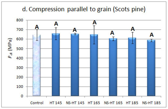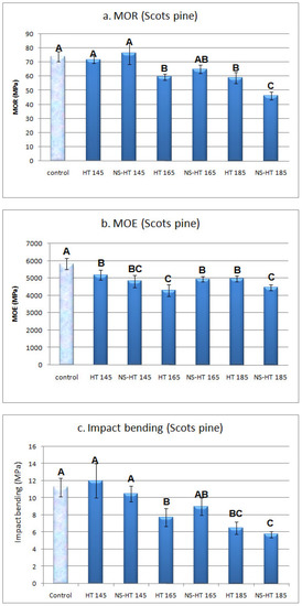 Mechanical properties, including modulus of rupture (a), modulus of elasticity (b), impact bending (c), and compression strength parallel to grain (d) in pine specimens heat-treated at 145, 165, and 185 °C and impregnated with silver nanosuspension (HT = heat-treated at a determined temperature; NS = nano-silver impregnated. MOR = modulus of rupture; MOE = modulus of elasticity. Letters on each column represent statistical groupings of mean values based on Duncan’s Multiple Range test at 95% level of confidence. Error bars represent standard deviation).