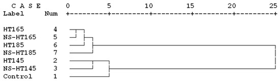 Cluster analysis related to the four physical and four mechanical properties, and the ATR-crystallinity values illustrated that HT145 and NS-HT145 treatments were clustered very close to control specimens (Figure 9). This indicated that although mass loss measurement showed slight thermal degradation at 145 °C, other effects of heat treatment on cell-wall polymers, such as hornification and formation of new hydrogen bonds, managed to compensate for the loss and, therefore, the overall properties could be considered rather the same as the control specimens. Similar clustering of HT145 treatments was reported for beech wood [46]. Therefore, it can be concluded that heat treatment at this temperature can only slightly affect the overall properties in low and medium density wood species. Moreover, the change on the properties is not necessarily negative while heat treatment can form new irreversible bonds between cell-wall polymers, eventually improving a number of properties at 145 °C. However, further studies should be carried out for every species to closely observe variability among different species in order to reaffirm this conclusion. Heat treatment at 165 °C and 185 °C illustrated distinctly different clustering compared to the control specimens, revealing significant effect of heat treatment at these two temperatures. Both un-impregnated and NS-impregnated treatments at 165 °C revealed very close clustering, implying that the improved thermal conductivity caused by silver nanoparticles had insignificant effect at this temperature on wood properties. However, the improved conductivity had higher effect at temperatures of 145 °C and 185 °C.