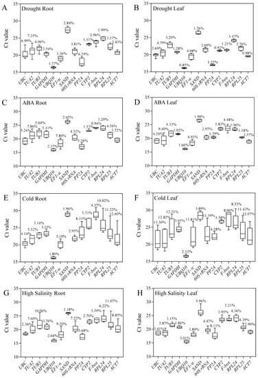 Threshold cycle (Ct) values of fourteen candidate reference genes in roots and leaves under various stresses and ABA treatment. Boxplot of Ct values of fourteen candidate reference genes from qRT-PCR analysis of root and leaf tissues. (A,B) Drought stress; (C,D) ABA treatment; (E,F) cold stress; and (G,H) high salinity stress. For each reference gene, the line inside the box is the median. The top and bottom lines of the box are the first and third quartiles, respectively. The values on top of box represent the coefficient of variation (CV) values.