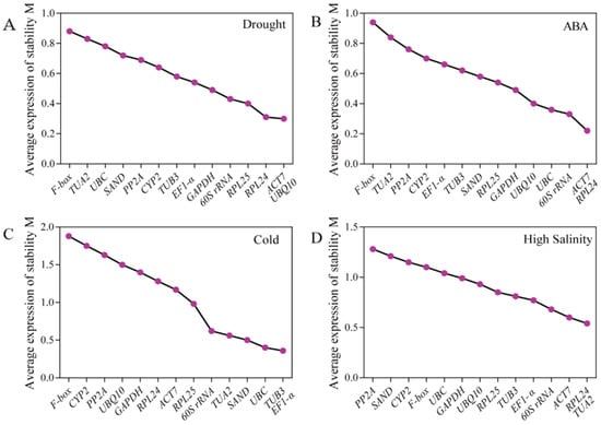 Average expression stability value (M) and ranking of the fourteen RGs across all stresses and ABA treatment calculated using geNorm. (A) Drought stress, (B) ABA treatment, (C) cold stress, and (D) high salinity stress. The least stable genes are listed on the left, and the most stable genes are listed on the right.
