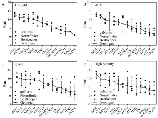 Comprehensive ranking of the fourteen RGs across all stresses and ABA treatment calculated as the geometric mean (Geomean) of three types of ranking (geNorm, NormFinder, and BestKeeper) for each sample group. (A) Drought stress, (B) ABA treatment, (C) cold stress, and (D) high salinity stress.
