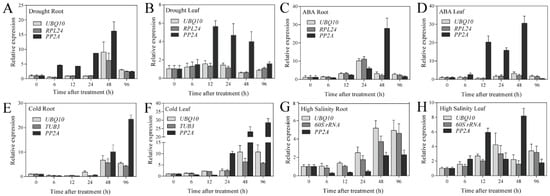 In our study, we calculated a comprehensive ranking of candidate genes based on the geometric mean of the rank results from three algorithms in each experimental condition. UBQ10 ranked as the most stable RG under all stresses and ABA treatment in P. ussuriensis. Our results were consistent with the stable expression of UBQ reported in Platycladus orientalis under NaCl and ABA treatments [], white clover leaves and stolons under water-limited and well-watered conditions [], Brachypodium distachyon in different tissues and under various hormone treatments [] and A. thaliana green siliques and seeds under hormone treatment []. However, UBQ showed less-stable expression in salt-stressed Suaeda aralocaspica seeds [] and in different developmental stages and photoperiodic treatments in soybean []. UBQ, which is primarily involved in proteolysis in the ubiquitin–proteasome system, appears to be regulated differently in different plant species and cell types and in response to different experimental conditions [,]. Therefore, although UBQ10 was a universally reliable RG in our study, further verification is needed to determine its suitability for use as an RG under other experimental conditions.