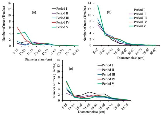 Diameter distribution of high-value timber species across census periods. (a) Monarch birch, (b) Castor aralia, and (c) Japanese oak. Number of trees indicate the mean values.