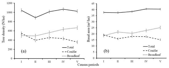The results in this study also clearly show another important temporal trend of the forest stand. The forest composition and structure in the study area changed over time after the first census period (1968 to 1978). The proportion of conifer in the first census period was 48.35%, and it decreased to 33% in the last census period. An increasing broadleaf proportion might contribute to an increased N of high-value timber species (Table 2). Broadleaf N and BA exceeded those of conifer after the first census period, wherein the N and BA of conifer were larger than those of broadleaf. Even though there might be several reasons for this, one of the possible reasons for decreased conifer N and BA would be due to a bias in tree marking for harvesting. Table 6 showed that the total harvested basal area for conifer always exceeds that of broadleaf in all census periods. Owari et al. [] indicated that even though spatially unbiased tree marking was obtained, tree species that were marked for selection harvest in our study area was mostly conifer species. In addition, they observed that the trees marked for harvesting were larger than the unmarked trees.