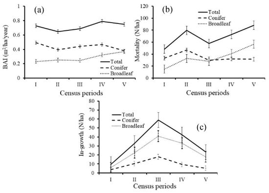 Figure 4 shows changes in the BAI, N-mor and N-rec of all species. The total BAI of all species showed no statistically significant difference in the first three census periods. However, it was significantly higher in the last two periods than in the first three periods (p < 0.05). The total BAI of broadleaf species increased while the conifer BAI decreased in the last census period. These results are also confirmed by the results of the mixed effect model in which a significant negative slope was observed for conifer and a positive slope was observed for broadleaf. The broadleaf N-rec that entered into the 5.0 cm DBH was higher than that of the conifer N-rec. For both conifer and broadleaf species, the N-rec decreased from the third census period (Figure 4). The number of total N-mor significantly increased since third census period. When comparing the conifer and broadleaf N-mor, the broadleaf N-mor increased from the third census period. However, there was no significant increase or decrease in conifer N-mor after the third census period. The mixed effect model also revealed an increase in the total N-mor over time. In addition, the broadleaf N-mor also increased over time.
