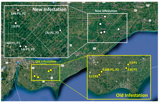 Paired plots (5 × 5 m) were established at each of two sites in Southwestern Ontario distinguished by differences in the timeline of infestation. The “old” infestation site (8–10 years since complete ash mortality) was located near Essex, Ontario (42°10′23” N, 81°46′12” W); the “new” infestation site (1–3 years since complete or nearly complete ash mortality) was located near Glencoe, Ontario (42°44′50” N, 81°42′34” W), approximately 90 km to the northeast (Figure 1). Site selection was not random insofar as we wanted to ensure a clear demarcation between closed and open canopy plots and congruence with previously published work [11]. Initial site selection was made by remote sensing (satellite images obtained from Google Earth™) followed by ground surveys. Site selection at the old site occurred after infestation had occurred whereas site selection at the new site occurred before infestation was evident. At both sites, selection was based on the following criteria: (1) the riparian forest in satellite images appeared intact and contiguous for at least 400 m in length and 30 m in width on each side of a distinct stream channel, (2) the riparian forest contained clusters of living ash in the new infestation and dead ash in the old infestation as determined from the ground surveys, (3) there was no indication of cattle grazing or other disturbances in the riparian areas, (4) the sites were reasonably accessible by road, and (5) permission to access was granted by landowners. The old infestation had five paired plots (10 plots in total) across four sites, and the new infestation had nine paired plots (18 plots in total) across five sites, all established in riparian areas such that one plot was situated directly in the center of a canopy gap (CG) area created by a cluster of dead ash, and the second plot in a nearby closed canopy (CC) area (little or no ash), approximately 25 m apart. The comparison of stands with dead ash versus non-ash stands was necessitated by the fact that no live ash remained (>90% mortality) at either site at the time the study was initiated.