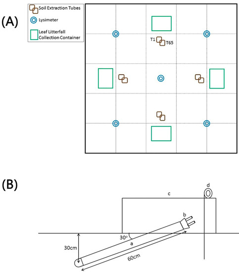 (A) Canopy Closed plots (CC) and Canopy Gap plots (CG) plots (5 × 5 m layout) showing the placement of soil sampling locations (incubation tubes), lysimeters, and litter collection containers. (B) Tension lysimeter system used for the extraction of water from the soil showing (a) a lysimeter with porous clay cup at a depth of 30 cm; (b) a rubber stopper with sealable air and soil solution extraction ports; (c) above-ground cover to protect the exposed portion of the lysimeter; and (d) a pigtail pin to keep the cover in place.