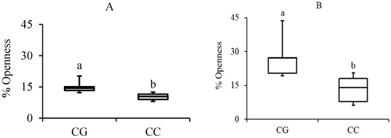 Percent openness for Canopy Gap (CG) plots and Canopy Closed (CC) plots for the new (A) and old (B) infestation sites. Boxes represent the 25th and 75th quartiles, and the horizontal line the median. The whiskers represent the maximum and minimum average plot values for the sites. Boxes with different letters indicate significant differences between the sites (Student’s t-test: new p = 0.002, old p = 0.03).