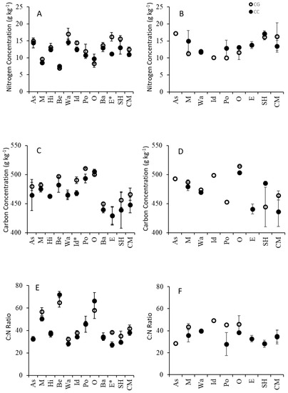 Mean (± standard deviation) leaf litter nitrogen (A,B) and carbon (C,D) concentrations (g kg−1) and C:N ratio (E,F) in the new (left-hand plots) and old (right-hand plots) infestations. Asterisk indicates tree genera with significant difference in nitrogen concentration (p < 0.05) between Canopy Gap (CG) plots and Canopy Closed (CC) plots (Student’s t-test: (A) elm p = 0.009, (C) ironwood p = 0.015, (E), elm (p = 0.004). As (Ash—Fraxinus), M (Maple—Acer), Hi (Hickory—Carya), Be (Beech—Fagus), Wa (Walnut—Juglans), Id (ironwood—Ostrya), Po (Polar—Populus), O (Oak—Quercus), Ba (Basswood—Tilia), E (Elm—Ulmus), SH (shrub), CM (Coarse Material).
