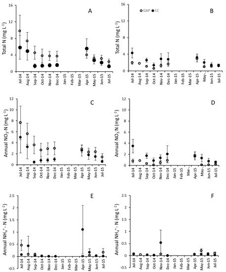 Mean (± SD) total N (A,B) NO3−-N (C,D), and NH4+-N (E,F) concentrations (mg L−1) in the soil solution at 30 cm depth. The Closed Canopy (CC) sites (closed circles) and the Canopy Gap (CG) sites (open circles) for the new (left-hand plots) and old (right-hand plots) infestations shown in the time series throughout the collection year.