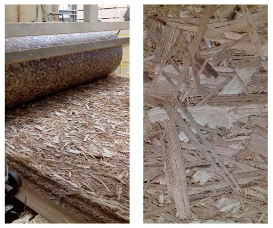 OSB 18 mm thick with dimensions 1250 × 2500 mm (Figure 1) was manufactured in the mill that currently produces 100% poplar OSB (I-PAN s.p.a., Casale Monferrato, Italy). The raw material consisted of poplar (‘I-214’ clone) and sweet chestnut logs from coppice stands with diameter 10–35 cm and length 150–200 cm. The strander was initially fed with poplar logs, then sweet chestnut logs gradually entered the process, resulting in a gradual shift of the mat composition from 100% poplar to 100% sweet chestnut wood.