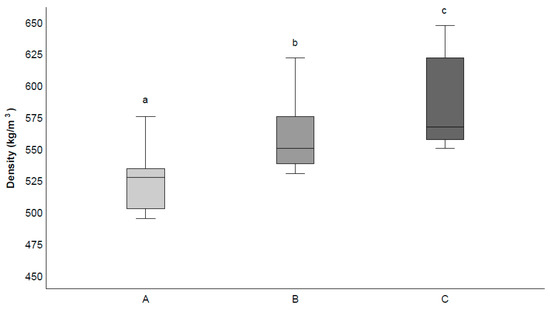 Density of OSB types [percentages of sweet chestnut wood (SC) and poplar (P) wood: A: 50% SC-50% P; B: 60% SC-40% P; C: 100% SC] grouped (a, b, c) based on statistical analysis (T-bars indicate maximum and minimum values).