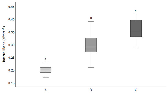 Internal bond of the OSB types [percentages of sweet chestnut wood (SC) and poplar (P) wood: A: 50% SC-50% P; B: 60% SC-40% P; C: 100% SC] measured according to EN 319, and grouped (a, b, c) based on statistical analysis (T-bars indicate maximum and minimum values).