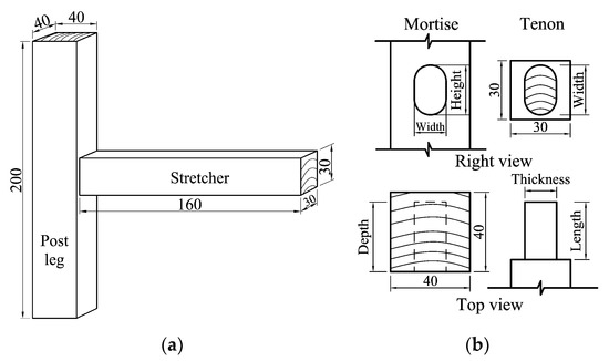 Previous studies have found several factors influencing the bending moment capacity (BMC) and bending stiffness of mortise-and-tenon (M–T) joints, such as wood species, annual ring, adhesive type, load type, tenon size, tenon geometry [1,2]. Among these studies, Erdil et al. [3] studied the effects of wood species, adhesive type and tenon size on the bending strength and flexibility of M–T joint T-shaped samples, indicating that the stiffness of M–T joints increased with the increase of tenon length and tenon width, and the tenon width had a more significant effect on BMC than tenon length. Likos et al. [4] evaluated the BMC and moment rotation characteristics of M–T joints as a function of tenon geometry, grain orientation, length, and shoulder fit. The results indicated that the BMC of all joints in which tenons were fully inserted into mortise was 54% greater than joints that were not fully inserted. Oktaee et al. [5] examined the effect of tenon geometry (width, thickness, and length) on the BMC of simple and haunched M–T joints under compression and tension states. Tenon length was found to have the greatest effect on BMC of M–T joints, followed by tenon width. Kasal et al. [6] studied the BMCs of L-shaped mortise and tenon furniture joints under both compression and tension loadings, considering the effects of wood species, adhesive type, and tenon size (width and length), which indicated that the tenon length had a greater effect on the BMC than tenon width. Záborský et al. [7] further studied the effects of wood species, adhesive type, joint type, tenon thickness, loading type, annual rings on bending elastic stiffness of samples. The results suggested that wood species, joint type, and tenon thickness had a significant effect on the bending elastic stiffness, but the loading type and annual ring were not significant.