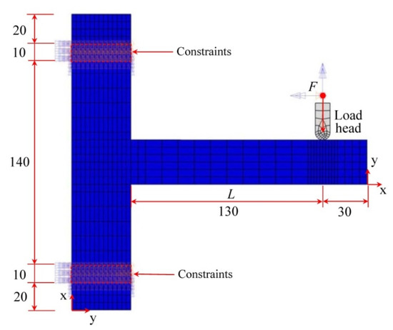 Figure 2 shows a 3-D orthotropic finite element model of an M–T joint T-shaped sample established using finite element software (ABAQUS 6.14-1, Dassult, USA). The mechanical properties used in this model were determined from the beechwood shown in Table 1. Ductile damage was used as a stress criterion for wood members in the model, and the parameters needed were fracture strain (0.0083), stress triaxiality (0.333), strain rate (0.01), and failure displacement (0.6452 mm). The grain orientations of post leg and stretcher were differentiated by local coordinates, i.e., x, y, and z corresponded to longitudinal, radial, and tangential directions of wood, respectively. The interactions of mortise and tenon were surface-to-surface contact, for the width direction of the tenon, the penalty contact property was specified with a friction coefficient of 0.54 [22] to simulate the friction behavior with 0.2-mm interference fit. In addition, for the thickness direction of tenon, cohesive behavior was applied to simulate the cohesive bonding behavior. The parameters needed in ABAQUS software Knn, Kss, and Ktt were 1.23, 3.49, and 2.45 N/mm, respectively, measured using the method described in [23]. The loading conditions referenced to a previous study [24], specifically, the boundary conditions were that six-degree freedoms were constrained at two parts, 20 mm from the two ends of the post leg, and a displacement load was imposed on the load head at the point of 30 mm from the end of stretcher to get the ultimate reaction force of load head, which was equal to the ultimate force (F) applied at the loading point (Figure 2). The mesh of the model was also shown in Figure 2, the sizes of all elements were approximate 5 mm, while for contact parts, the sizes of elements were approximate 2 mm to make the model more accurate. The element type assigned to the T-shaped sample was C3D8, an 8-node linear brick element. A 4-node 3-D bilinear rigid quadrilateral element (R3D4) was assigned to load head.