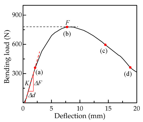 A typical bending load and deflection curve of the M–T joint measured 30 mm long by 15 mm wide with four critical loading points, (a) 364 N in linear stage, (b) the maximum load 778 N, (c) 594 N at failure stage, and (d) 366 N at failure stage.