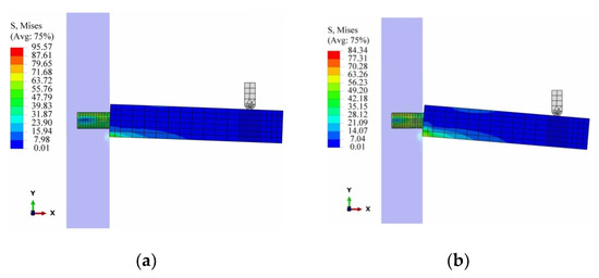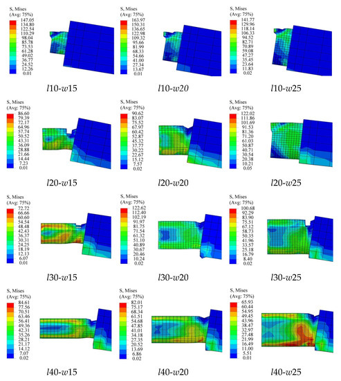 Figure 5 summarized the failure modes of all finite element models with different tenon sizes. Two typical failure modes were observed. When the tenon length was shorter than tenon width, the failure occurred at the front end of the tenon, indicating that the tenon was completely pulled out from the mortise because of fracture of glue without damage of tenon, and the glue cannot provide enough strength to hold the tenon. In case of the tenon length being longer than or equal to the tenon width, the tenons fractured at the rear end of tenon because of tenon fracture in tension perpendicular to the grain. In other words, the tenon withdrew completely from the mortise when the ratio of tenon width to tenon length was higher than 1, otherwise, the M–T joint failed because of the fracture of tenon at the rear end of the tenon. Therefore, it was recommended to make the tenon length longer than tenon width to get the higher BMC in the design of the M–T joints. In general, the stress at the failure part should reach the peak value. While in the finite element model, once the stress exceeds the ultimate strength of the material, the elements at the places of damage are degraded and deleted, which make the stress at damage part smaller than other undamaged parts.