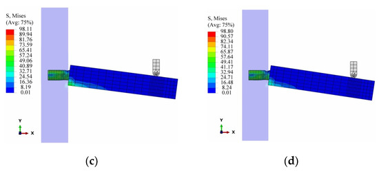 Stress distributions of the M–T joint T-shaped sample at different loading stages corresponding to the four points shown in Figure 3; (a) 364 N in linear stage, (b) the maximum load 778 N, (c) 594 N at failure stage, and (d) 366 N at failure stage. (unit MPa).