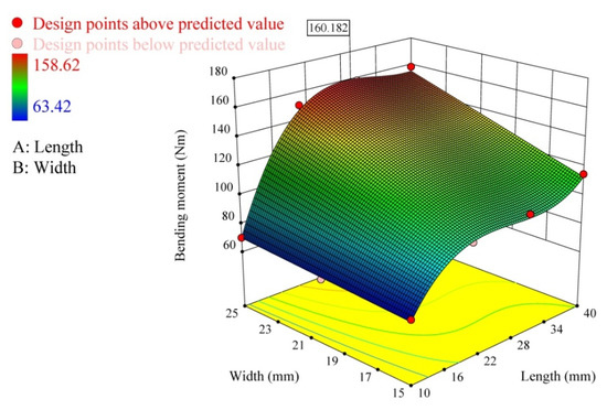 Figure 6 shows the response surface model used to predict the BMC of M–T joints relating to the tenon width and tenon length. The response surface reduced cubic model for predicting the BMC of M–T joints was derived, as shown in Equation (6). Additionally, the ANOVA result of model terms is shown in Table 5.